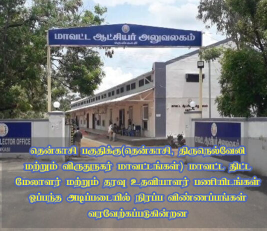 தென்காசி பகுதிக்கு மாவட்ட திட்ட மேலாளர் மற்றும் தரவு உதவியாளர் பணியிடங்களை ஒப்பந்த அடிப்படையில் நிரப்ப விண்ணப்பங்கள் வரவேற்கப்படுகின்றன.